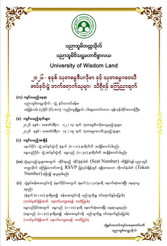 (င) ဘွဲ့နှင်းခန်းမ အတွင်းသို့နံနက်ပိုင်း အတွက် နံနက် (၇:၀၀) နာရီမှစတင်ဝင်ရောက်နေရာယူနိုင်သည်၊