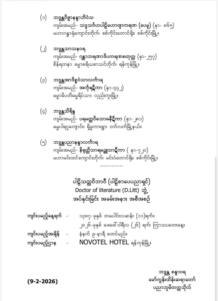 ပညာဘူမိတက္ကသိုလ် Degree Certificate အပ်နှင်းခြင်း အစီအစဉ်အရ ၂၀၂၆-ခုနှစ်တွင် ပါဠိကျမ်းစာကို သုတ်သင်တည်းဖြတ်၍ တင်သွင်းသည့် ဆရာတော် ၅-ပါးအား ပါဠိသတ္ထဝိဘာဝီ (ပါဠိစာပေပညာရှင်) Doctor of Literature in Pali Degree Certificate (D.Litt) ဘွဲ့ကို အပ်နှင်းမည် ဖြစ်ကြောင်း ထုတ်ပြန်ကြေညာအပ်ပါသည်။